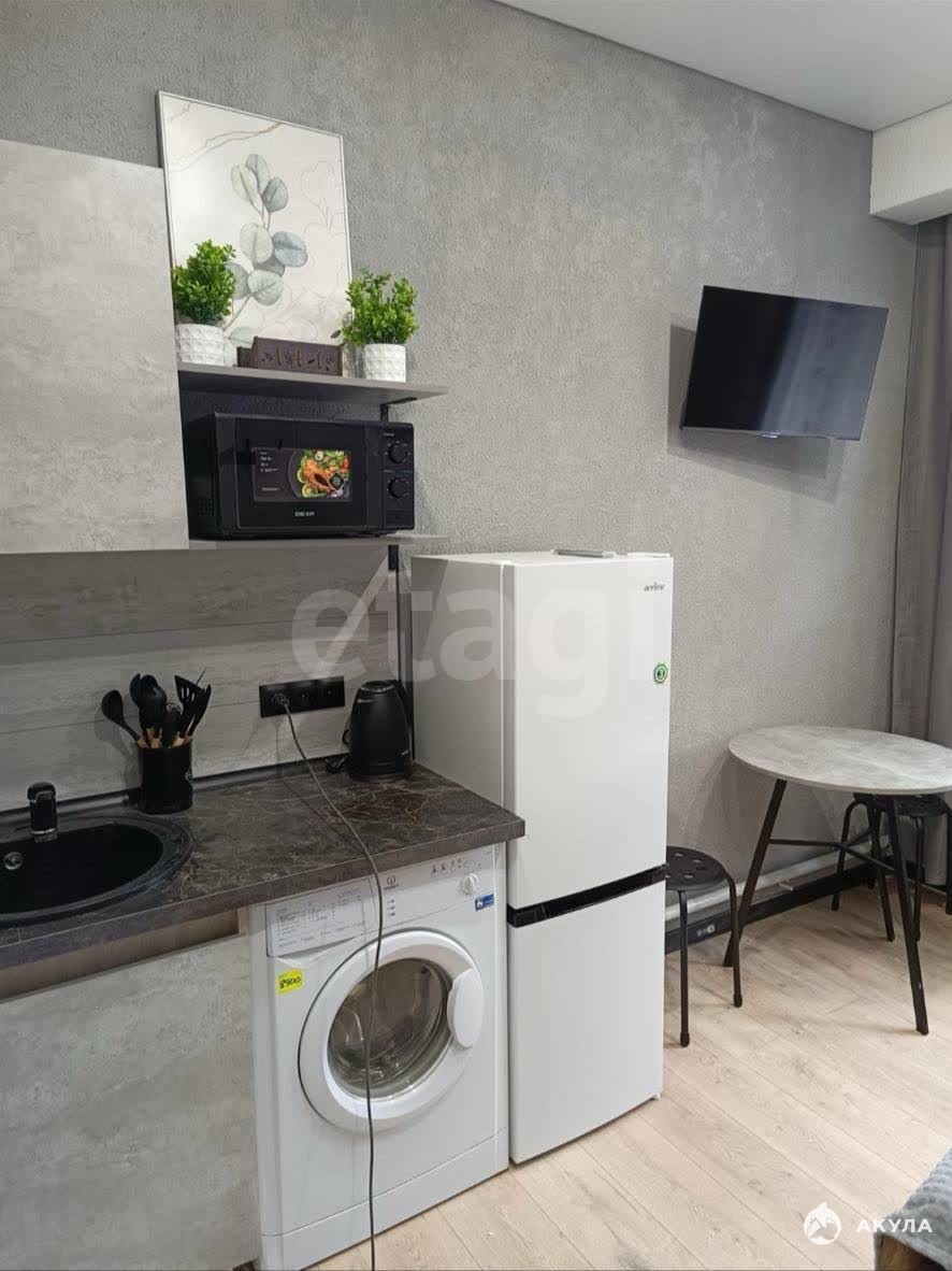 В квартире имеется: Кухонный гарнитур, кухонный стол, стулья, шкаф, кровать, холодильник, стиральная машина, электрическая плита, чайник, телевизор, микроволновая печь.