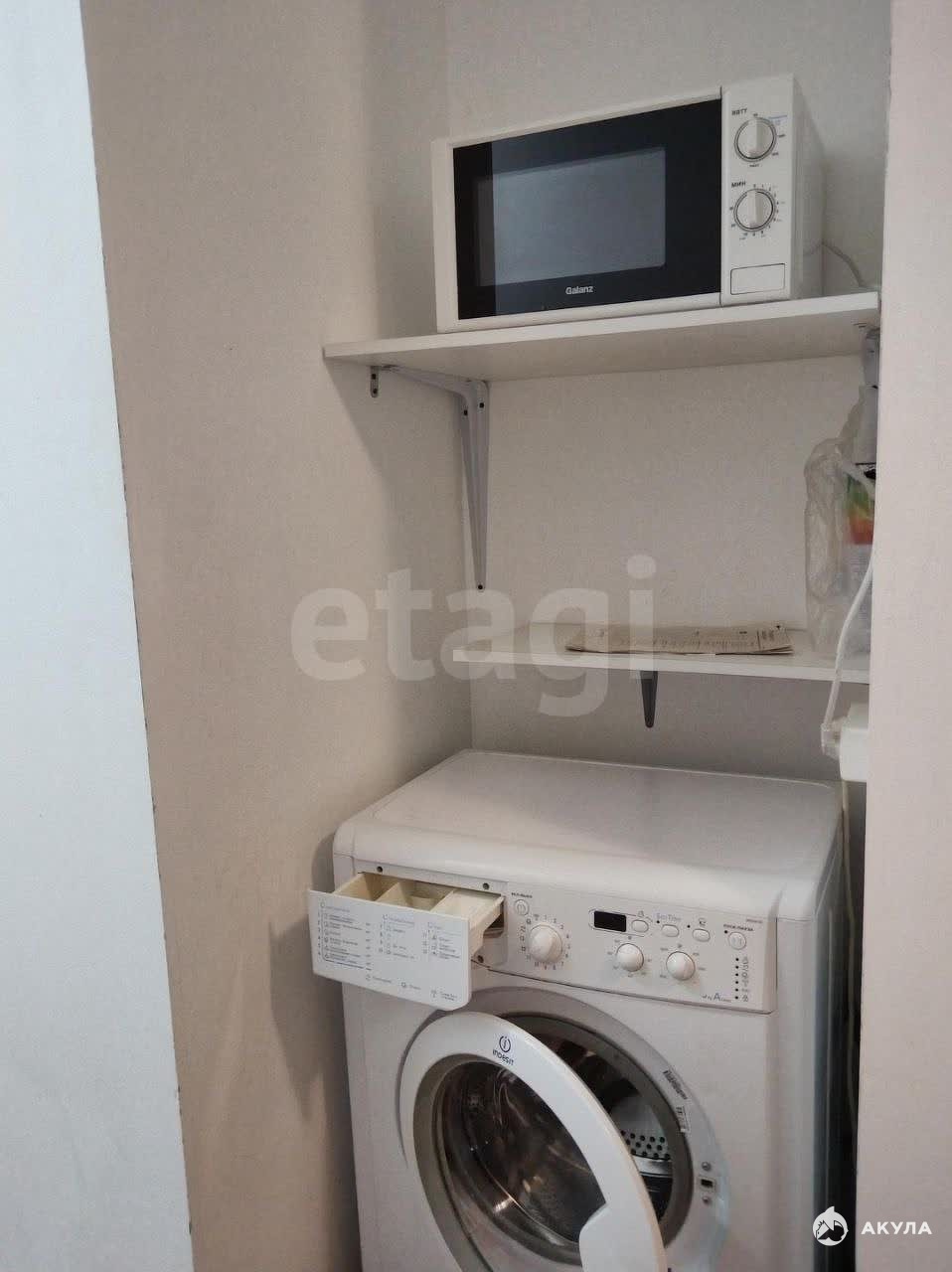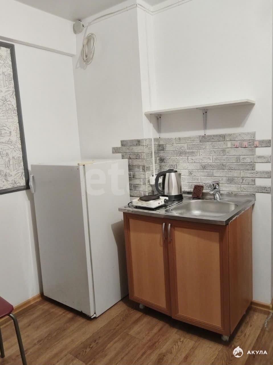 В квартире есть необходимая мебель и техника для проживания: раскладной диван, кухонный гарнитур, стол и стулья, шкаф, холодильник, электрическая конфорка, автоматическая стиральная машина и чайник.