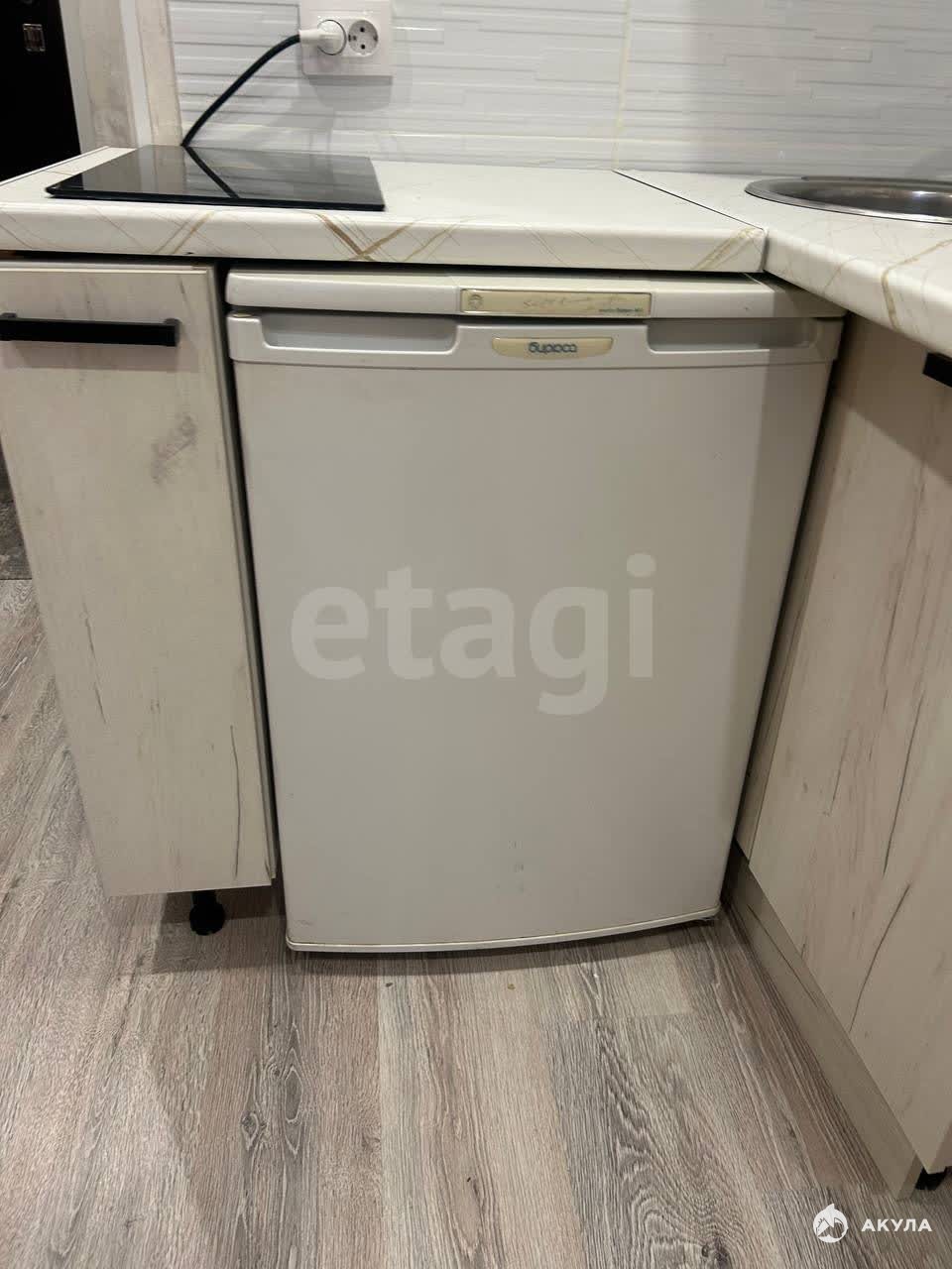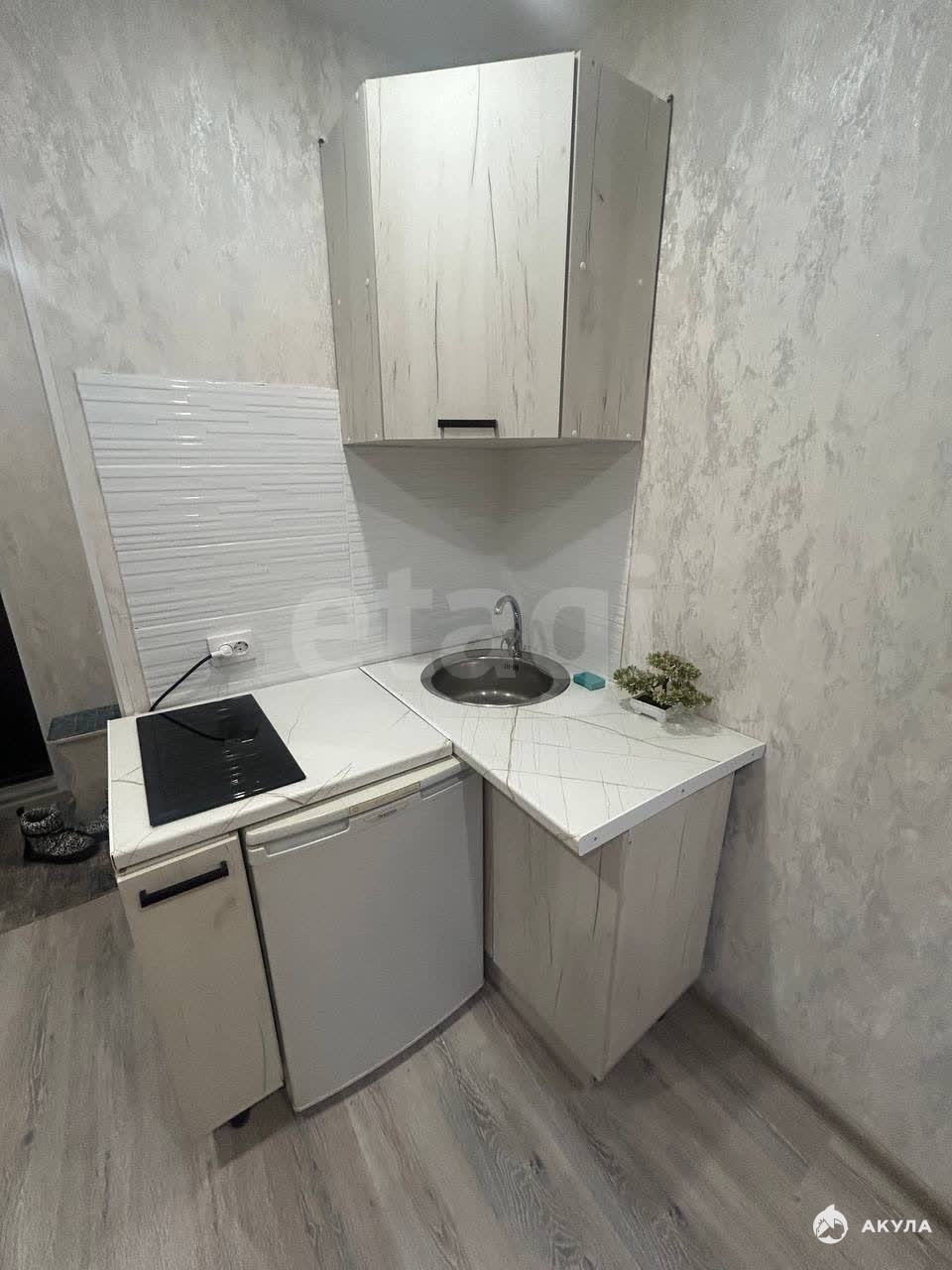 Есть санузел с ванной, кухня с индукционной плитой, холодильник, диван, тумба.