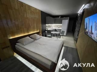 В квартире выполнен дизайнерский ремонт. Просторная кухня оснащена всем необходимым: встроенный холодильник, плита, микроволновая печь и обеденный стол. В зоне отдыха установлен телевизор.Совмещенный санузел оборудован современной сантехникой и стиральной машиной. В комнате большая кровать и вместительные шкафы для хранения вещей.