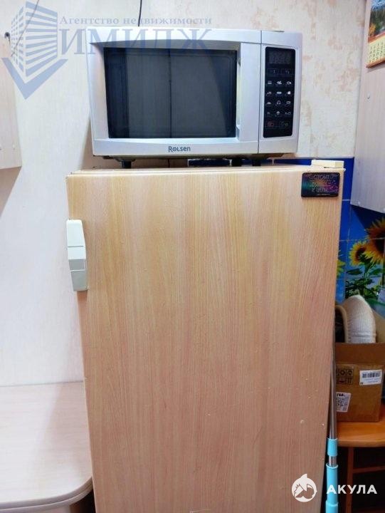 Холодильник, микроволновка, чайник, телевизор, кухонный гарнитур, стол, шкаф купе для вещей, раскладной диван, журнальный столик.