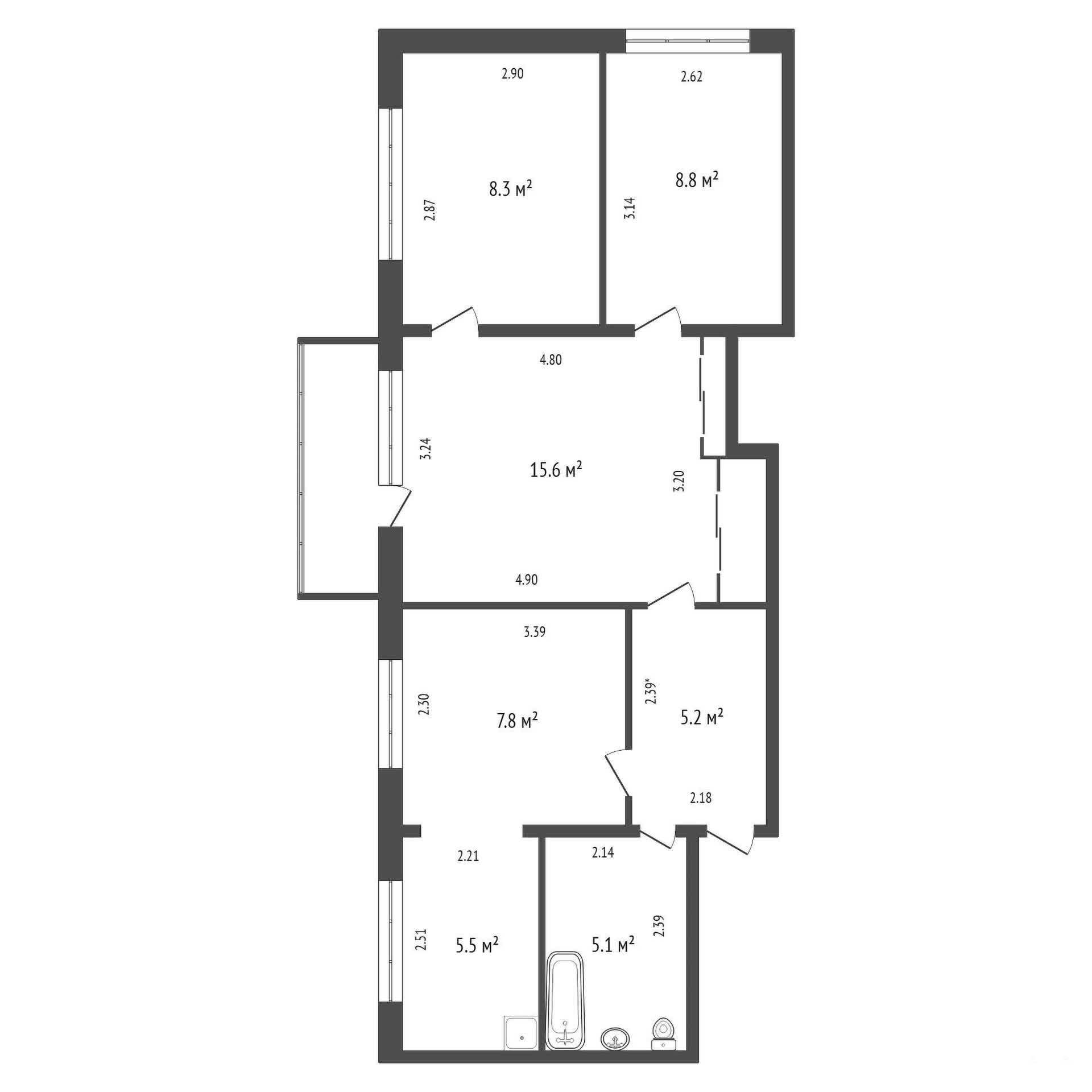 Общая площадь — 57, 7 м², большая кухня— 13, 3 м², зал 15, 6 м² и две комнаты по— 8, 3 м².